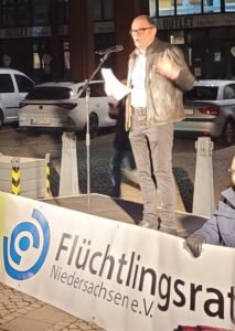 Sebastian Wertmüller vom Flüchtlingsrat Niedersachsen beklagte in seiner Rede die Entrechtung der Geflüchteten und die Zusammenarbeit mit dem menschenverachtenden Taliban-Regime. Er verwies auf Rechtsbrüche an den deutschen und den europäischen Grenzen und kritisierte eine Politik, die schutzsuchende Menschen im Mittelmeer ertrinken lässt. Sein Resümee: