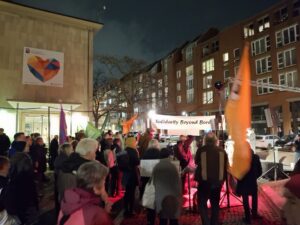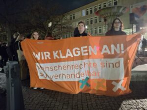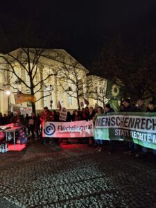 Etwa 300 Menschen versammelten sich am Internationalen Menschenrechtstag (10.12.2025) vor dem niedersächsischen Landtag, um ein Zeichen zu setzen dafür, dass sie mit dem gegenwärtigen Kurs der Bundesregierung nicht einverstanden sind, die die Würde der Schutzsuchenden verletzt und die Menschenrechte mit Füßen tritt.