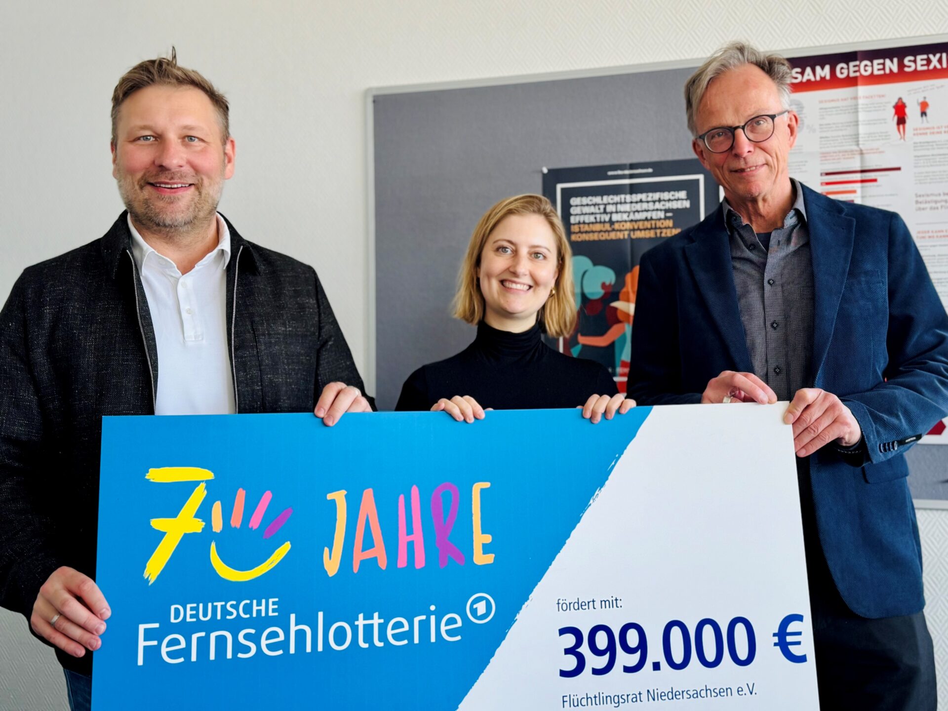 BU: (v.l.n.r.) Stephan Masch, Repräsentant der DEUTSCHEN FERNSEHLOTTERIE; Annika Hesselmann, Mitarbeiterin des geförderten Projektes & Kai Weber, Geschäftsführer des Flüchtlingsrat Niedersachsen e.V. bei der symbolischen Übergabe der Fördersumme in Hannover