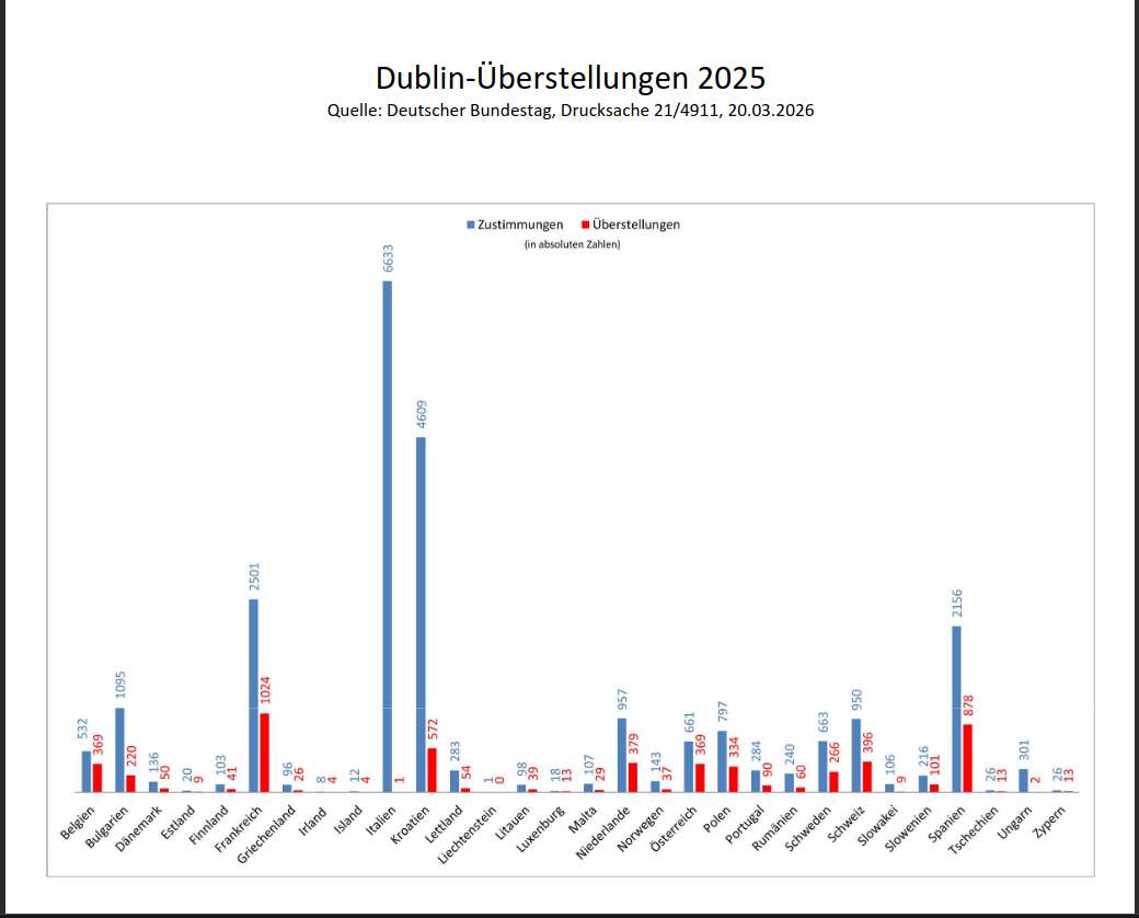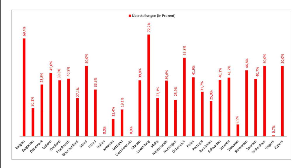 Insgesamt bleibt die Überstellungsquote für viele Länder auf niedrigem Niveau: Deutschland stellte insgesamt 35.942 Überstellungsersuchen. In 23.912 Fällen stimmte der ersuchte Dublin-Vertragsstaat einer Aufnahme zu. Vollzogen wurden 5377 Abschiebungen – das entspricht rund 22,5% aller Fälle, bei denen eine Zustimmung erfolgte.