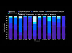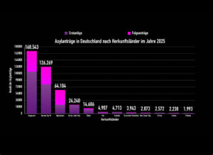 Die Hauptherkunftsländer sind im Jahr 2025 – wie schon in den vergangenen Jahren – Afghanistan, Syrien und die Türkei, die in der Summe über die Hälfte aller Asylanträge auf sich vereinen. In der überwiegenden Zahl dieser Staaten kommt es häufig zu schweren Menschenrechtsverletzungen.